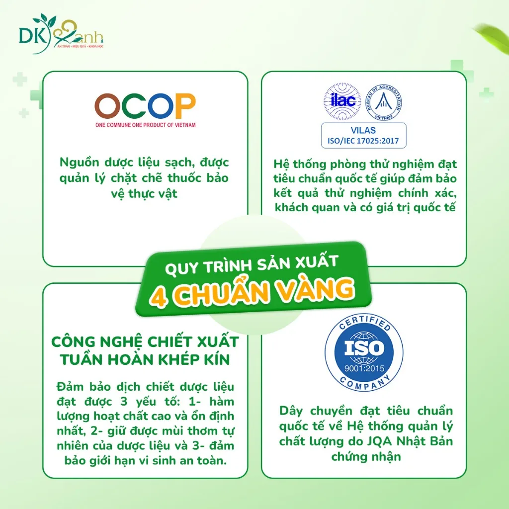 – Sản xuất chuẩn quốc tế: Nhà máy DK Pharma đạt chuẩn GMP-WHO, GLP, GSP, ISO 13485:2016, ISO/IEC 17025:2017.