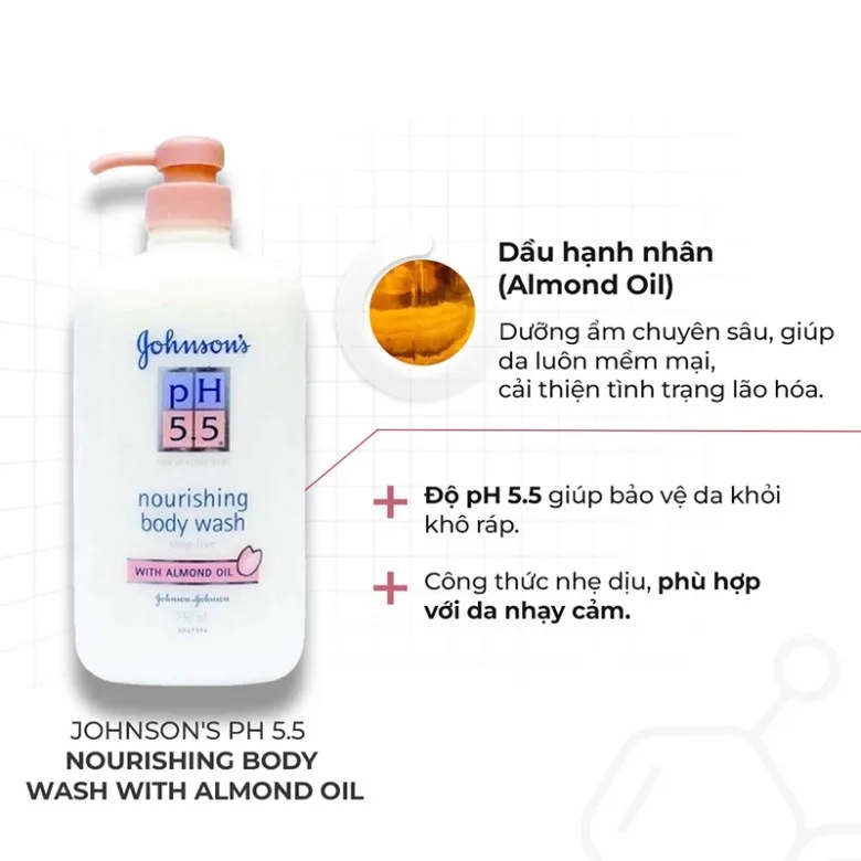Johnson’s pH 5.5 Nourishing Body Wash With Almond Oil là sữa tắm dưỡng ẩm giúp làm sạch da đồng thời công thức chứa tinh dầu hạnh nhân đem đến cho bạn làn da mềm mại, mịn màng đầy sức sống.
