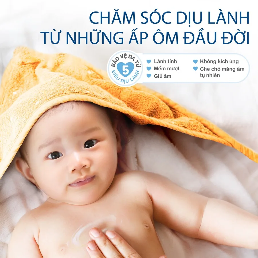 – Nuôi dưỡng và bảo vệ màng ẩm tự nhiên của da giúp da bé phát triển khỏe mạnh với 5 điều dịu lành: lành tính, không kích ứng, mềm mượt, giữ ẩm và che chở màng ẩm tự nhiên.