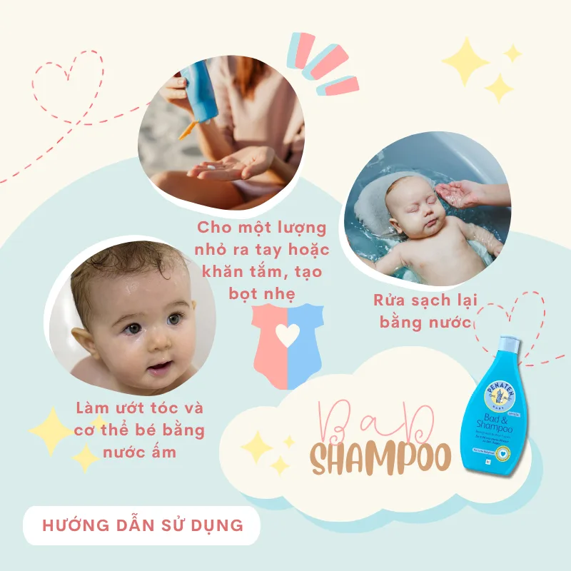 + Cho một lượng nhỏ Penaten® Bath & Shampoo ra tay hoặc khăn tắm, tạo bọt nhẹ nhàng và rửa sạch lại bằng nước.